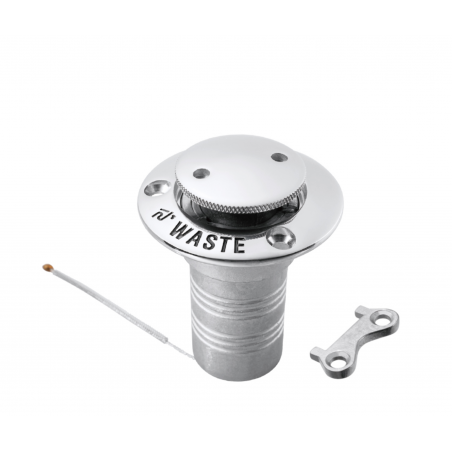 Mirror-polished AISI 316 stainless steel flush-mounted boarding cap with stainless steel safety cable and return spring. To open, press and turn the upper part, which pops out automatically, allowing the cap to be unscrewed.