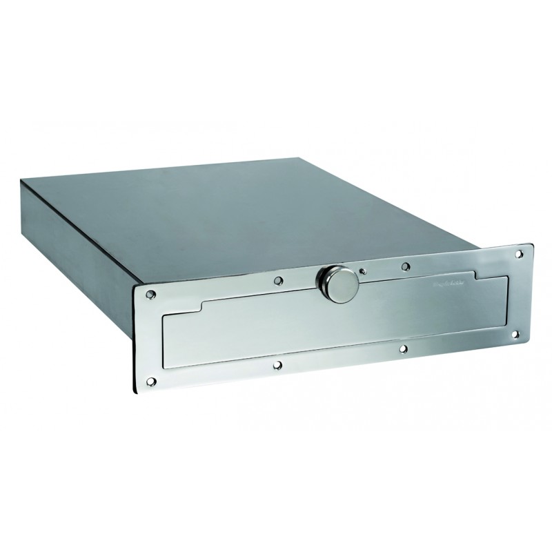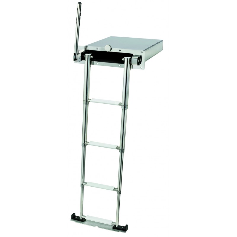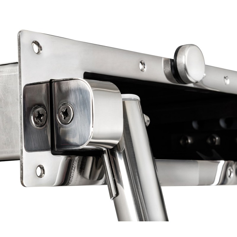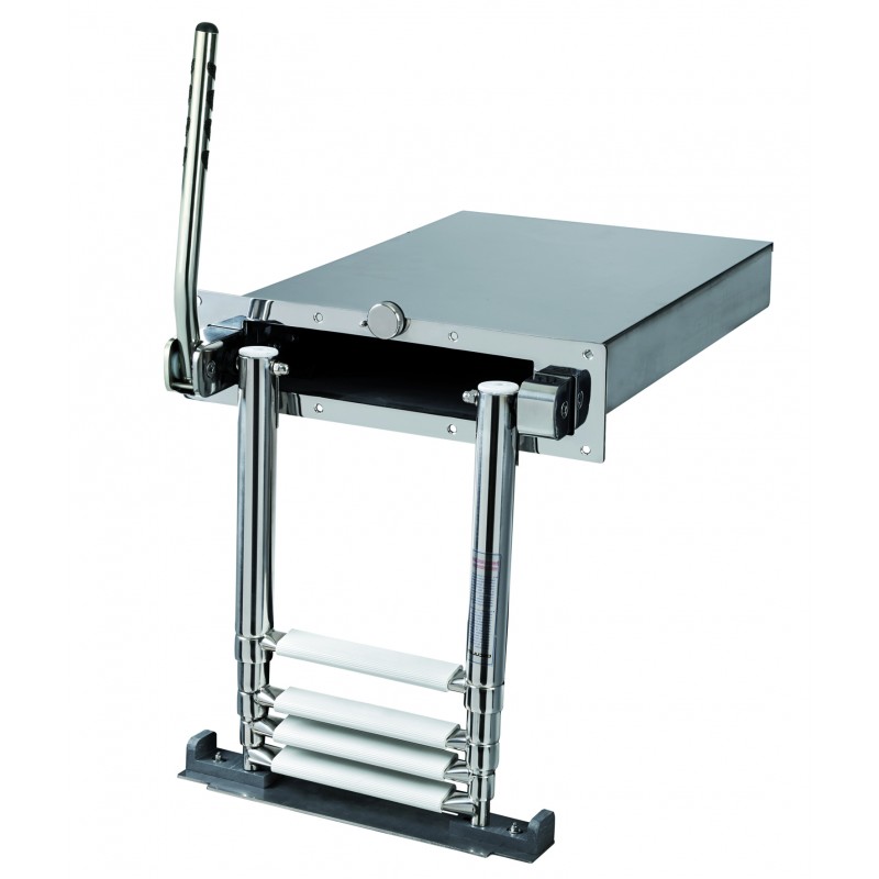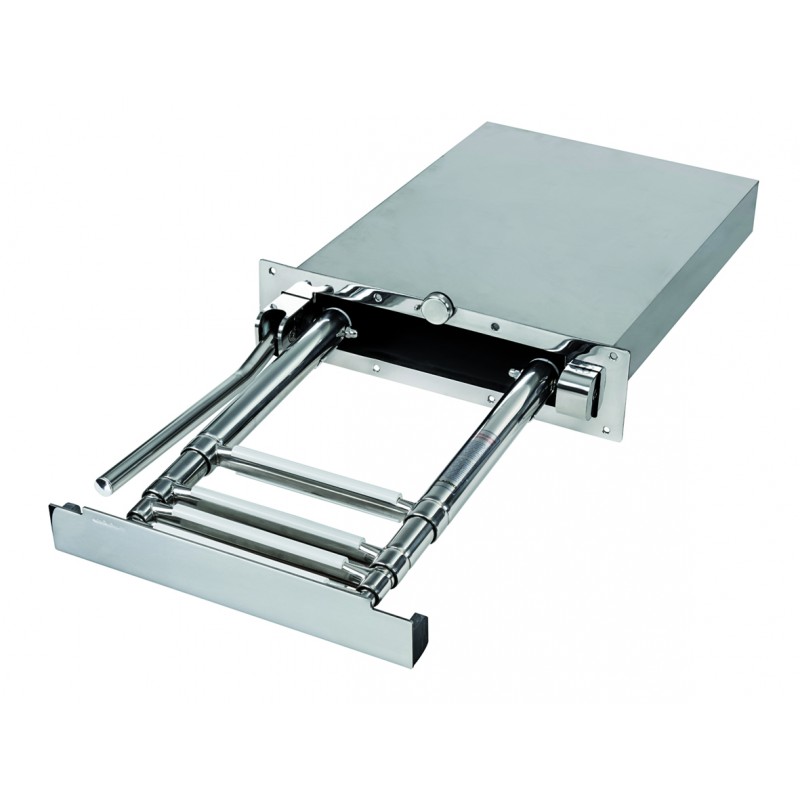 One 316 stainless steel telescopic retractable ladder with automatic handle system. The single handle facilitates access on board compared to two-handle versions. The brackets have increased thickness for better strength and the handle makes it easier to close from the stern platform. Installation of the box recessed into the thickness of the swim platform. Snap-on operation.