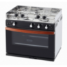 3-burner stove in stainless steel with tempered glass door, real wood handle, oven (capacity 19 L, capacity 1500W) equipped with grill (capacity 1350W). Equipped with safety thermocouple, side flame shields, cast iron burners, anti-roll pot stop, oven door lock and cardan support (tilting). Electric ignition. Use with propane / butane gas, connection pressure 30 mbar.