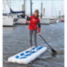 Passerella galleggiante realizzata in PVC + EVA, resistente ai raggi UV. Superficie antiscivolo sulla parte superiore. 4 anelli a D in acciaio inossidabile: uno per ogni angolo per fissare la tavola in qualsiasi ambiente, sia come passerella che come piattaforma. Manometro integrato per il controllo istantaneo della pressione. Si distingue per il poco spazio richiesto a bordo, la leggerezza e l’eccezionale rigidità quando gonfiata. Più lunga e larga della maggior parte delle passerelle rigide tradizionali, è anche più versatile: diventa piattaforma da bagno o paddle board se si aggiungono le pinne. Fornita di borsa per il trasporto, due pinne, una pompa ad alta pressione e un kit di riparazione.
