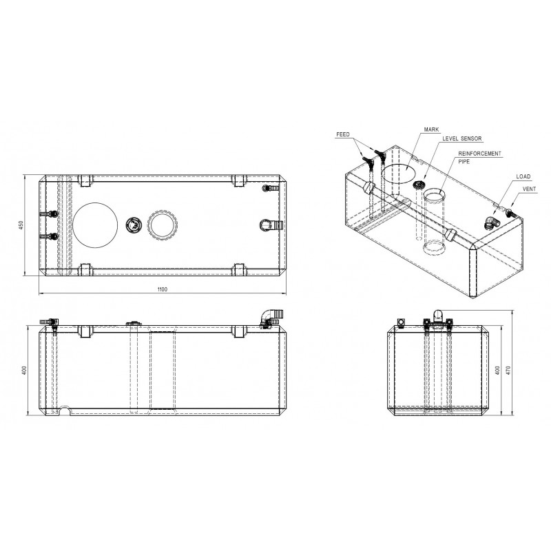 Provvisto di sensore di livello universale, può funzionare o a 10-180 ohm o a 240-33 ohm vedere le istruzioni, inserti per imbarco, sfiato Ø mm 16, pescante e ritorno Ø mm 12. Ogni serbatoio è collaudato singolarmente.