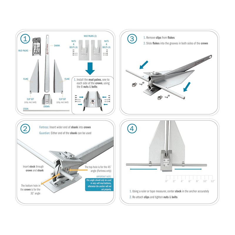 Ancora Fortress in lega di alluminio e magnesio è l’ancora leggera più rinomata, dalle prestazioni unanimemente riconosciute. Completamente smontabile, è facilissima da maneggiare per tutto l’equipaggio. Con esclusive pale orientabili da 32° a 45°, che aumentano la tenuta dell’ancora del 400% su fondali morbidi. Non magnetica, non arrugginisce. Comode per lo stoccaggio o per sostituire un singolo elemento se necessario.