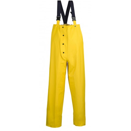 Cerata leggera ed impermiabile in poliestere giallo con spalmatura in PVC e cuciture saldate ad alta frequenza, dotata di larghe bretelle elastiche registrabili, dorsale elastica con fondo saldato e rinforzato, ampia apertura anteriore (dal petto al cavallo) con bottoni a pressione e cinghiette regolabili alle caviglie con chiusura a velcro.