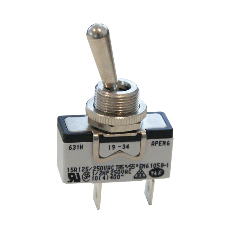 corpo in termoindurente, levetta e bussola in ottone nichelato, contatti in argento. Terminali Faston. Capacità 15 Amp. tensione 250V, unipolare.