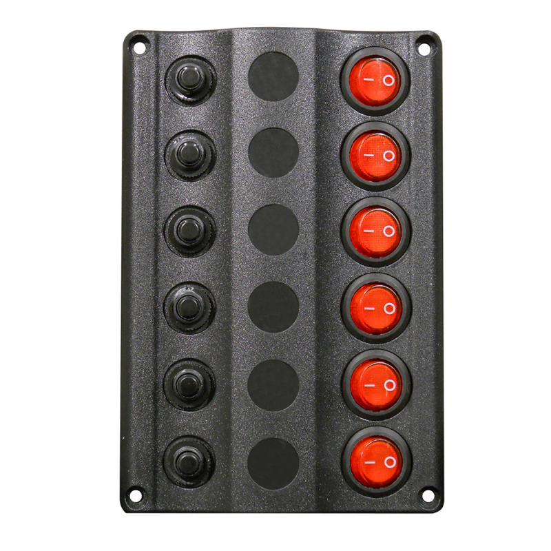 Pannello elettrico in plastica nera con interruttori basculanti ON-OFF, luce a LED per indicare la linea attiva e magnetotermici di protezione sovraccarico. Per impianti a 12 vdc.