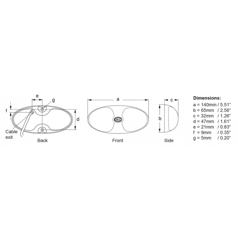 Luce di utilità stagna IP67 per installazioni esterne ed interne, ideale per passaggi, sala macchine e vani motore. Corpo in Nylon caricato con componenti antivibrazione e lenti in acrilico antiurto, entrambi resistenti UV. Omologazione protezione antideflagrazione CE-ISO8846. Alimentazione 9/33V, consumo 2,5W, luce diffusa bianca 5000 K° con 180 lumen di luminosità. Completa con cavo marino da 50 cm.