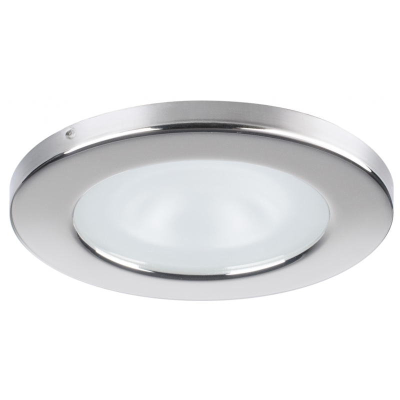 Faretto stagno IP65 ad alta luminosità ( 280 Lumen ), luce bianca calda, con cornice circolare in acciaio inox AISI 316 lucido. Sensibile alla polarità.