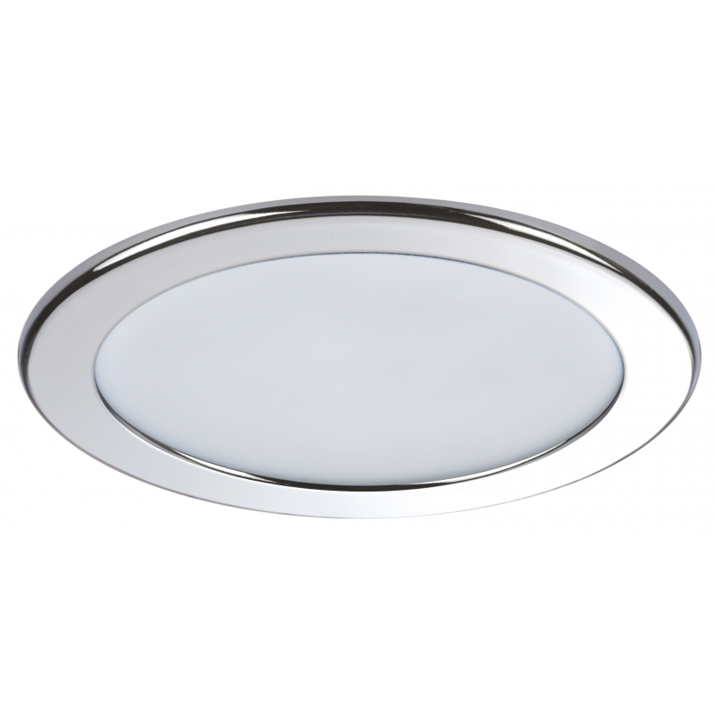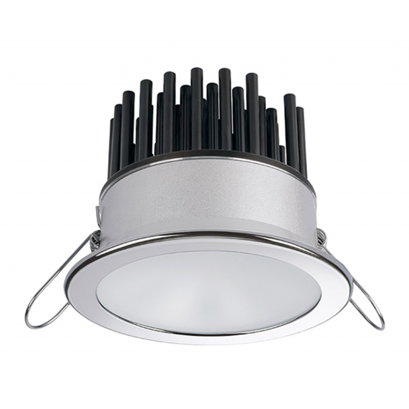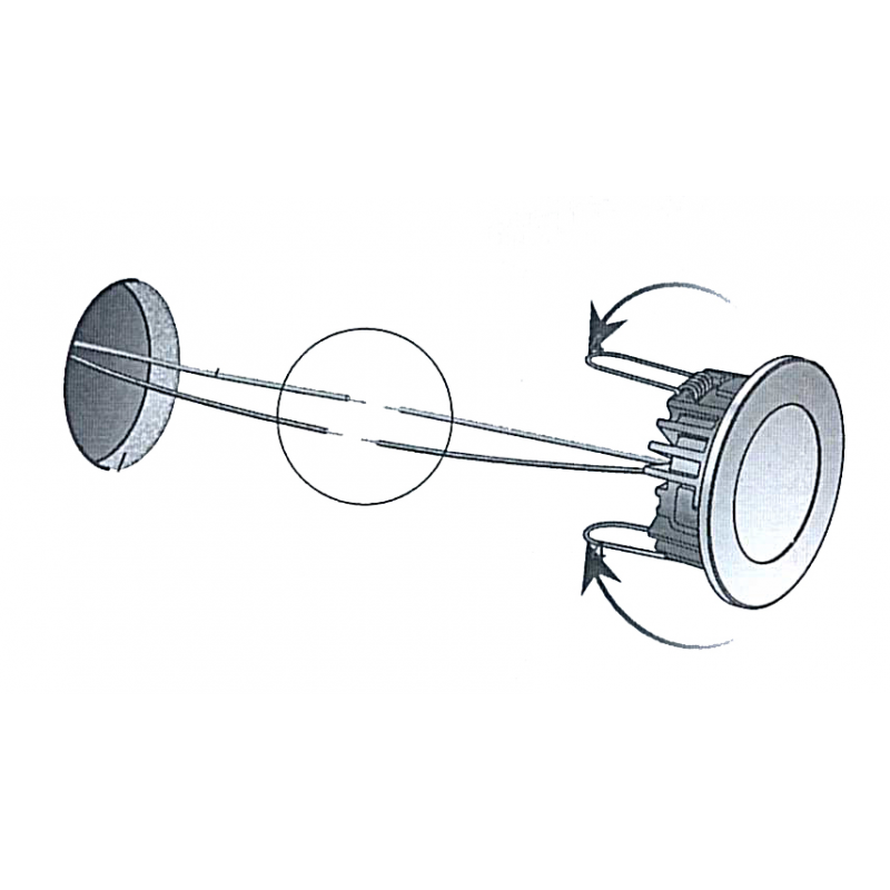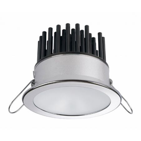 Faretto stagno IP40 ad alta luminosità ( 380 Lumen ), luce bianca calda, con cornice circolare in acciaio inox AISI 316 lucido. Sensibile alla polarità. Fissaggio con molle.