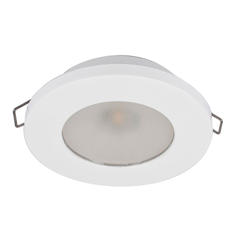 Faretto stagno IP40 a 2 LED ( 100 Lumen ) ad alta luminosità, luce bianca calda con cornice circolare in plastica a finitura bianca RAL 9010.